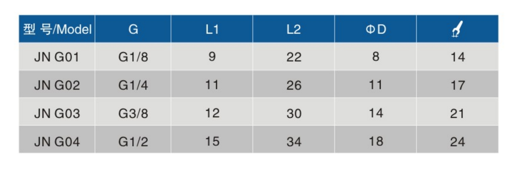 • 螺纹规格1:G1/8、G1/4、G3/8、G1/2