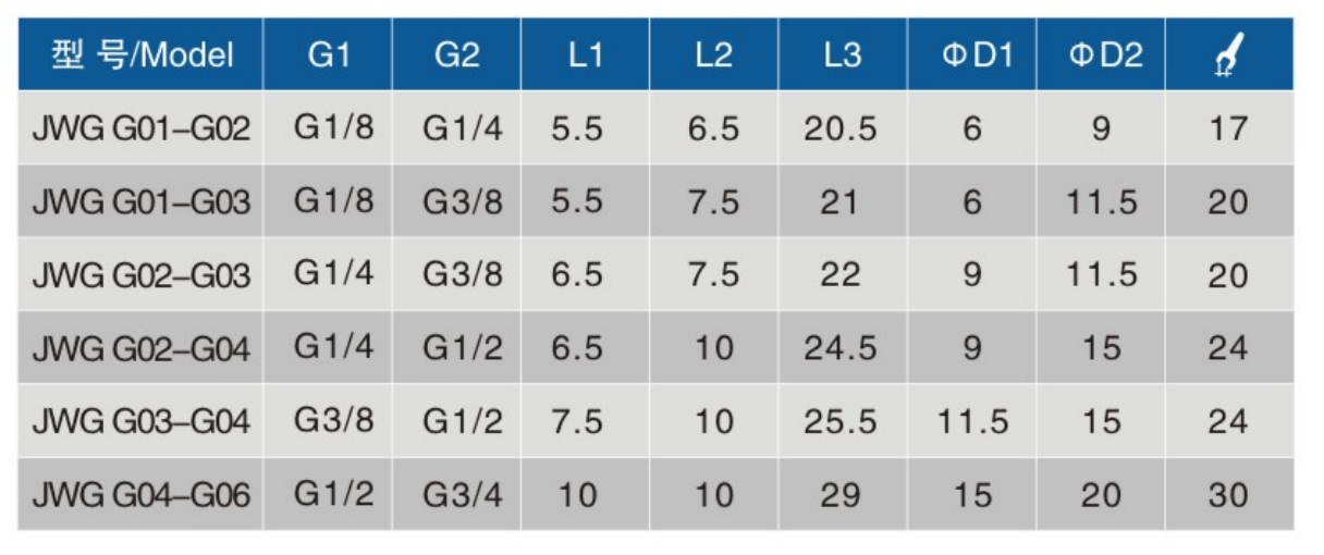 • 螺纹规格1:G1/8、G1/4、G3/8、G1/2