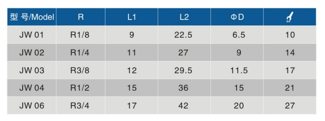 • 螺纹规格1:R1/8、R1/4、R3/8、R1/2