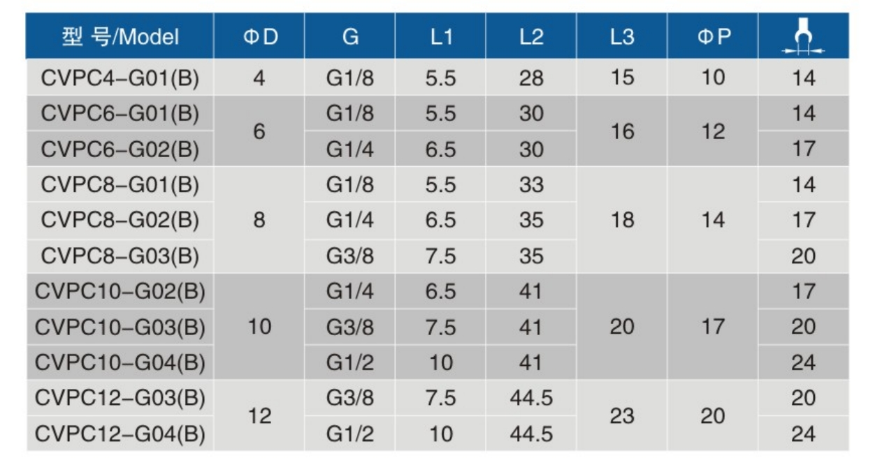 • 螺纹规格:G01 (B)、G02 (B)、G03 (B)、G04 (B)