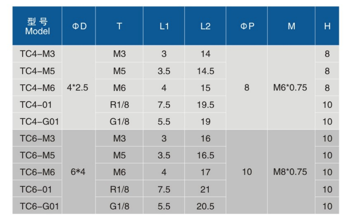 • 螺纹规格:M3、M5、M6、01、G01