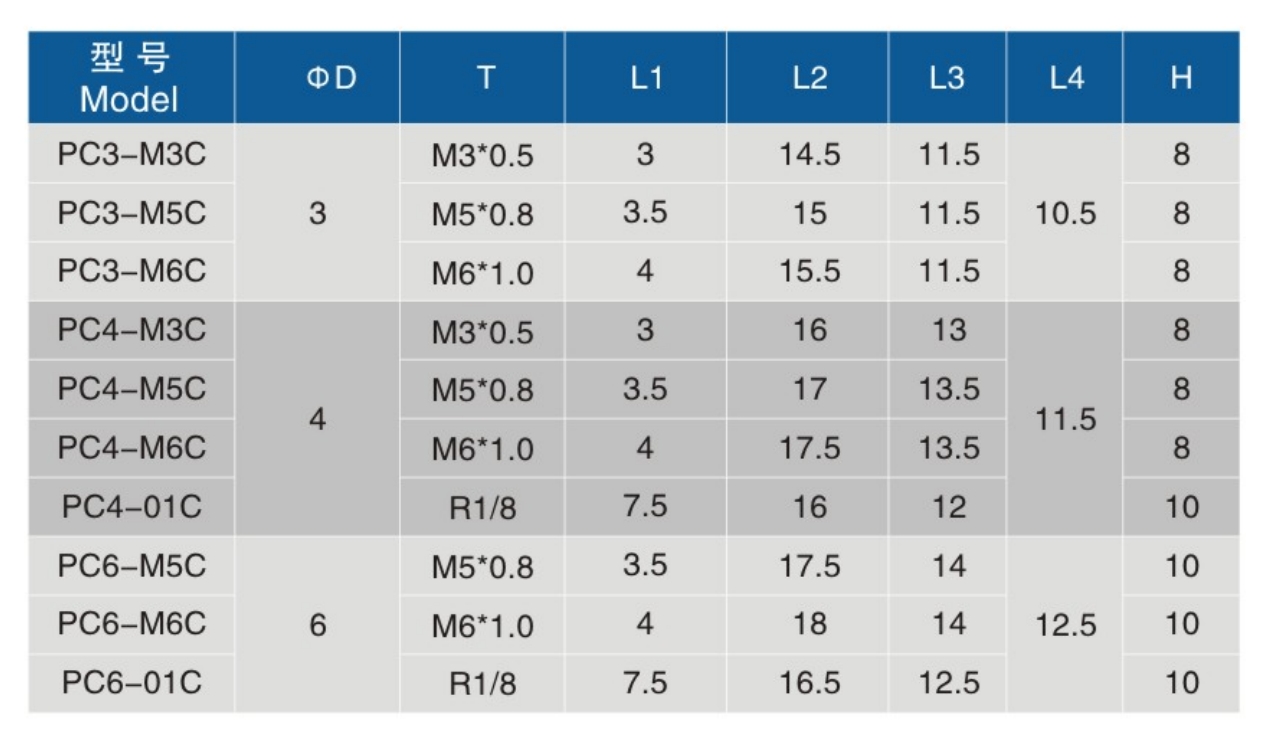 • 螺纹规格:M3C、M5C、M6C、01C