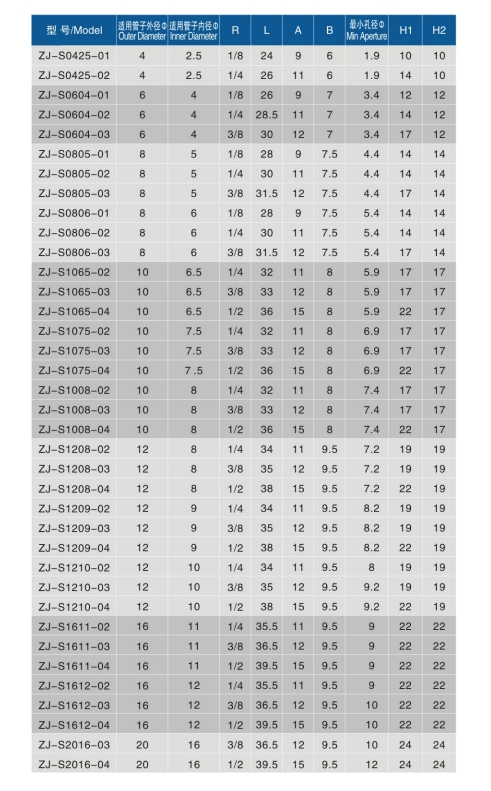 • 适用管子规格:4*2.5、6*4、8*5、8*6、10*6.5、10*7.5、10*8、12*8、12*9、12*10、16*11、16*12、20*16