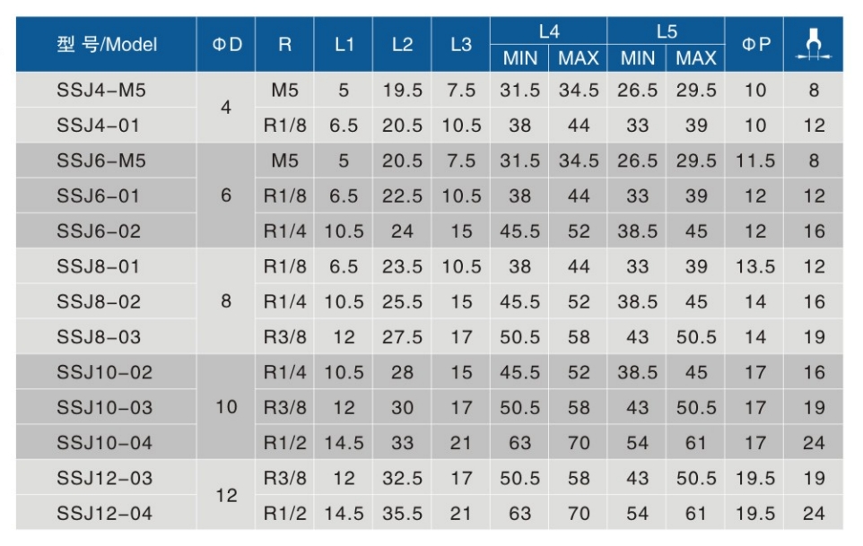 • 螺纹规格:M5、01、02、03、04