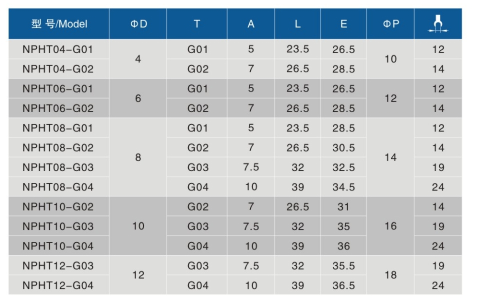 • 螺纹规格:G01、G02、G03、G04