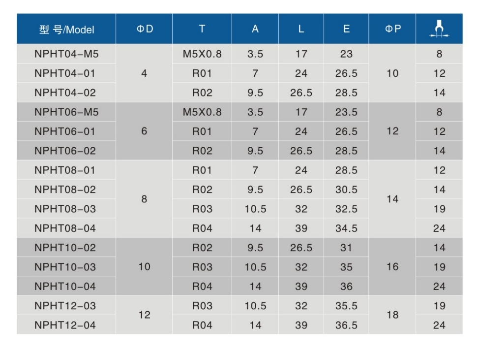 • 螺纹规格:M5X0.8、R01、R02、R03、R04