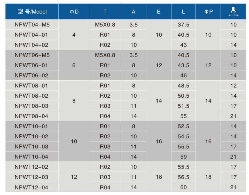 • 螺纹规格:M5X0.8、R01、R02、R03、R04