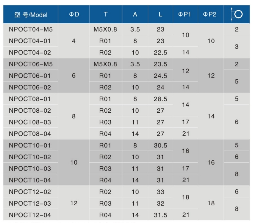 • 螺纹规格:M5X0.8、R01、R02、R03、R04