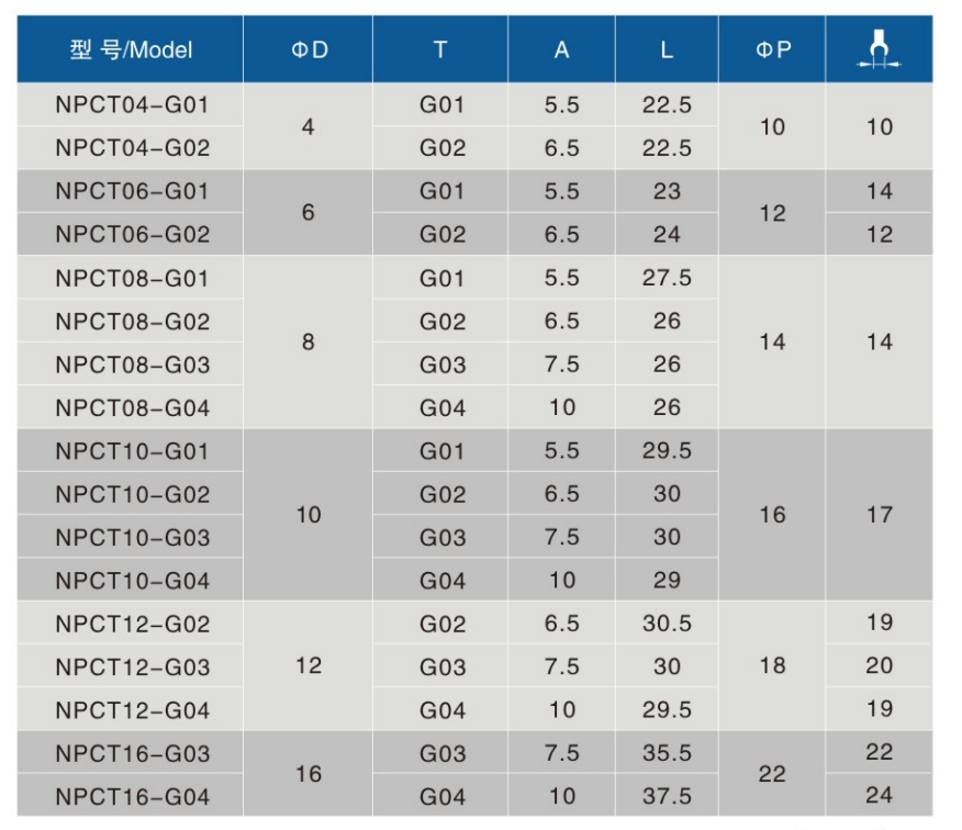 • 螺纹规格:G01、G02、G03、G04