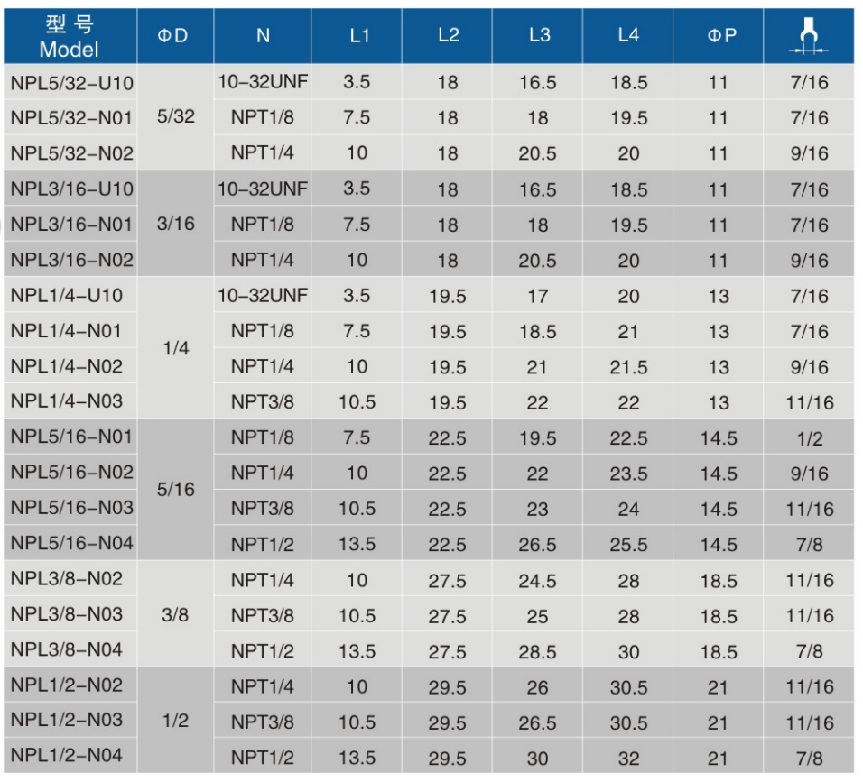 • 螺纹规格:U10、N01、N02、N03、N04