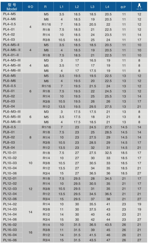 • 螺纹规格:M5、M6、0.5、01、02、03、M5-II、M6-II、01-II、M3-III、M5-III、M6-III、04、06